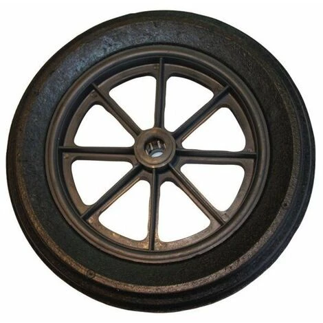 Roue de brouette en caoutchouc plein pour un faible écrasement, une bonne roulabilité et une utilisation silencieuse. Corps de roue polypropylène à rayons ou plein en acier. Roulement à rouleaux.