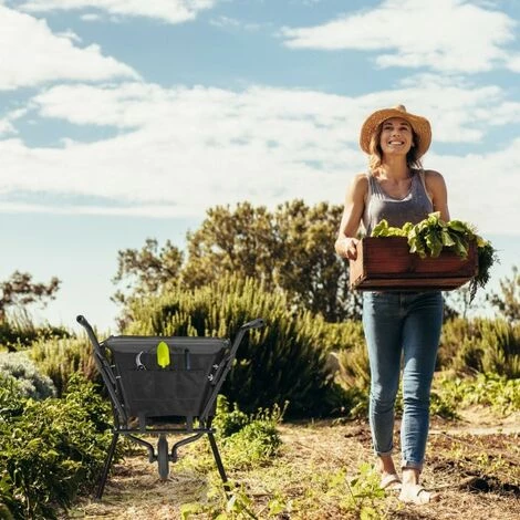 Facilement pliable_x000D_Pour les travaux du jardin_x000D_Se range de manière peu encombrante_x000D_Avec roue en caoutchouc sans air_x000D_Poignées en plastique