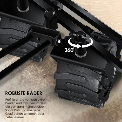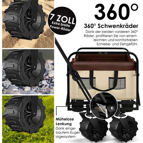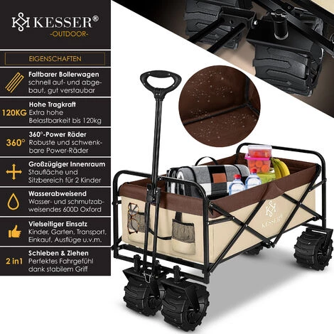 Le chariot pliable KESSER est un outil polyvalent. Le chariot de transport KESSER est votre compagnon idéal pour toutes vos escapades. Grâce au grand espace de chargement ainsi qu’aux portes-boissons supplémentaires, il permet à vos enfants de profiter d’un environnement spacieux lors d’excursions, de festivals ou d’autres activités de loisirs. Il se monte rapidement et se range sans prendre de place. Ses roues extra larges assurent une bonne stabilité et une conduite en toute sécurité, même sur un sol mou comme le sable. Cette grande charrette à bras vous offre de la place et beaucoup de confort grâce à l’épais rembourrage du châssis. Laissez-vous emporter ! En plus des 2 supports intégrés à l’avant pour les boissons, les petits bagages et les sacs de rangement, cette remorque de transport est équipée de poignées pour la tirer ou la pousser, ainsi que de roues pivotantes à 360° équipées d’un système de freinage. Ce chariot à roulettes pliable à pneus larges est utilisable sur des pavés irréguliers, de l’herbe ou du sable par exemple. Son système de freinage flexible assure une sécurité suffisante et réagit immédiatement. En un tour de main, le grand chariot à roulette se plie et se range sans prendre de place. Il vous permettra de profiter de longues escapades ! En effet, ce chariot vous permet d’emporter beaucoup plus de bagages ! Il est idéal pour le camping, les barbecues, le shopping au centre commercial, les randonnées dans un parc ou d’autres activités de plein air. L’espace intérieur est suffisant pour vos sorties avec les enfants que ce soit à des festivals ou pour faire d’autres activités. Il est possible de le replier de manière compacte quand vous le désirez. Il dispose d’une poignée centrale réglable avec fonction de basculement et d’une roue avant d’une rotation de 360°. Le matériau résistant et la structure stable du châssis offrent une capacité de charge maximale de 80 kg.