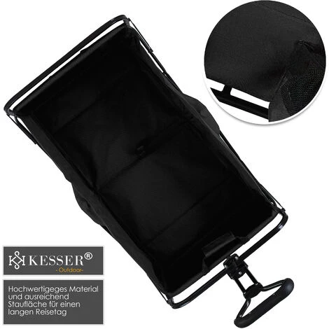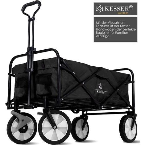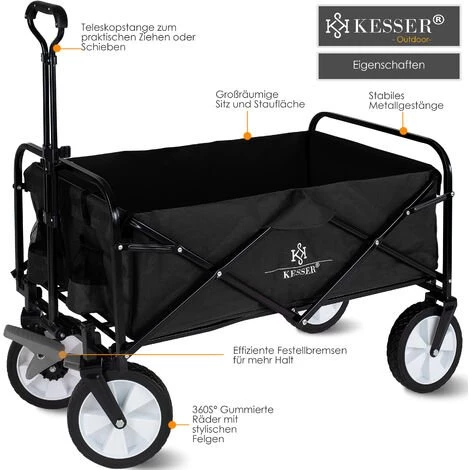 Le chariot pliable KESSER est un outil polyvalent. C’est le compagnon idéal pour toutes vos escapades. Grâce au grand espace de chargement ainsi qu’aux portes-boissons supplémentaires, il permet à vos enfants de profiter d’un environnement spacieux lors d’excursions, de festivals ou d’autres activités de loisirs. Il se monte rapidement et se range sans prendre de place. Ce chariot à main offre de la place et beaucoup de confort grâce à l’épais rembourrage du châssis. En plus des 2 supports intégrés à l’avant pour les boissons et les petits bagages, le chariot est équipé de poignées pour le tirer ou le pousser, de roues pivotantes à 360° et de freins. Il se plie et se range en un tour de main sans prendre de place. Grâce à ce chariot de transport pliable, vous allez pouvoir profiter de longues excursions en famille ! En effet, il vous permet d’emporter beaucoup plus de bagages ! Il est idéal pour le camping, les barbecues, le shopping au centre commercial, les randonnées dans un parc ou d’autres activités de plein air. L’espace intérieur est suffisant pour vos sorties avec les enfants, découvrir des festivals ou faire d’autres activités et il est possible de le replier de manière compacte quand vous le désirez. Il dispose d’une poignée centrale réglable avec fonction de basculement et d’une roue avant d’une rotation de 360°. Le matériau résistant et la structure stable du châssis offrent une capacité de charge maximale de 80 kg.