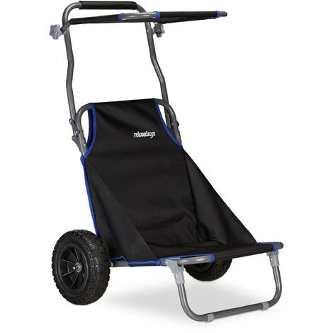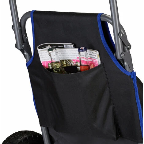 Utilisez simplement la chaise longue comme chariot de transport sur le chemin du retour du lac à la maison. Rabattez simplement pour cela la béquille sur le devant. Vous pouvez alors tirer confortablement le chariot de plage par la poignée à rembourrage et transporter les serviettes de bain, les chaussures de plages etc. sans effort. Le transport se fait sans difficultés sur le sable grâce aux roues larges en caoutchouc dur. Même des objets aiguisés ne peuvent rien faire aux pneus increvables.