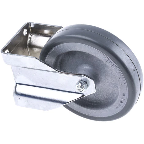 Pneu en caoutchouc gris, antistatique – Platine rectangulaire. Pneus en caoutchouc antistatiques gris Fourches chromées Applications d’utilisation modérée à moyenne Roulettes pivotantes munies d’une double bague de roulement à billes dans la tête pivotante