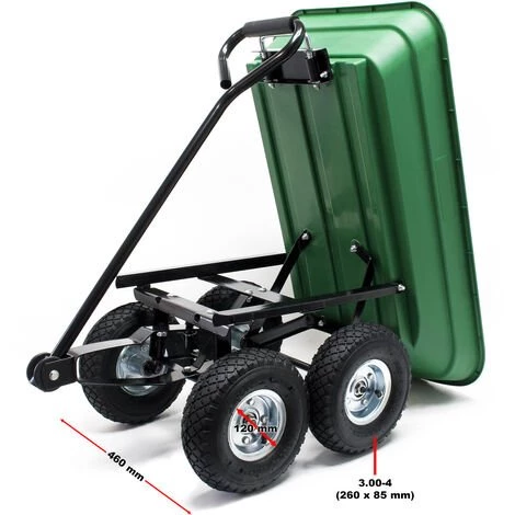 La zone de chargement fermée en plastique permet le transport d’objets de grande taille, comme par exemple, les bûches, les outils, les plantes ou bien les aliments alimentaires, mais aussi le sable et d’autres matériaux en vrac. Le châssis robuste en métal et résistant confine le chariot une haute capacité. Par ailleurs, l’essieu mobile et les quatre pneumatiques garantissent un transport simple et très sûr.